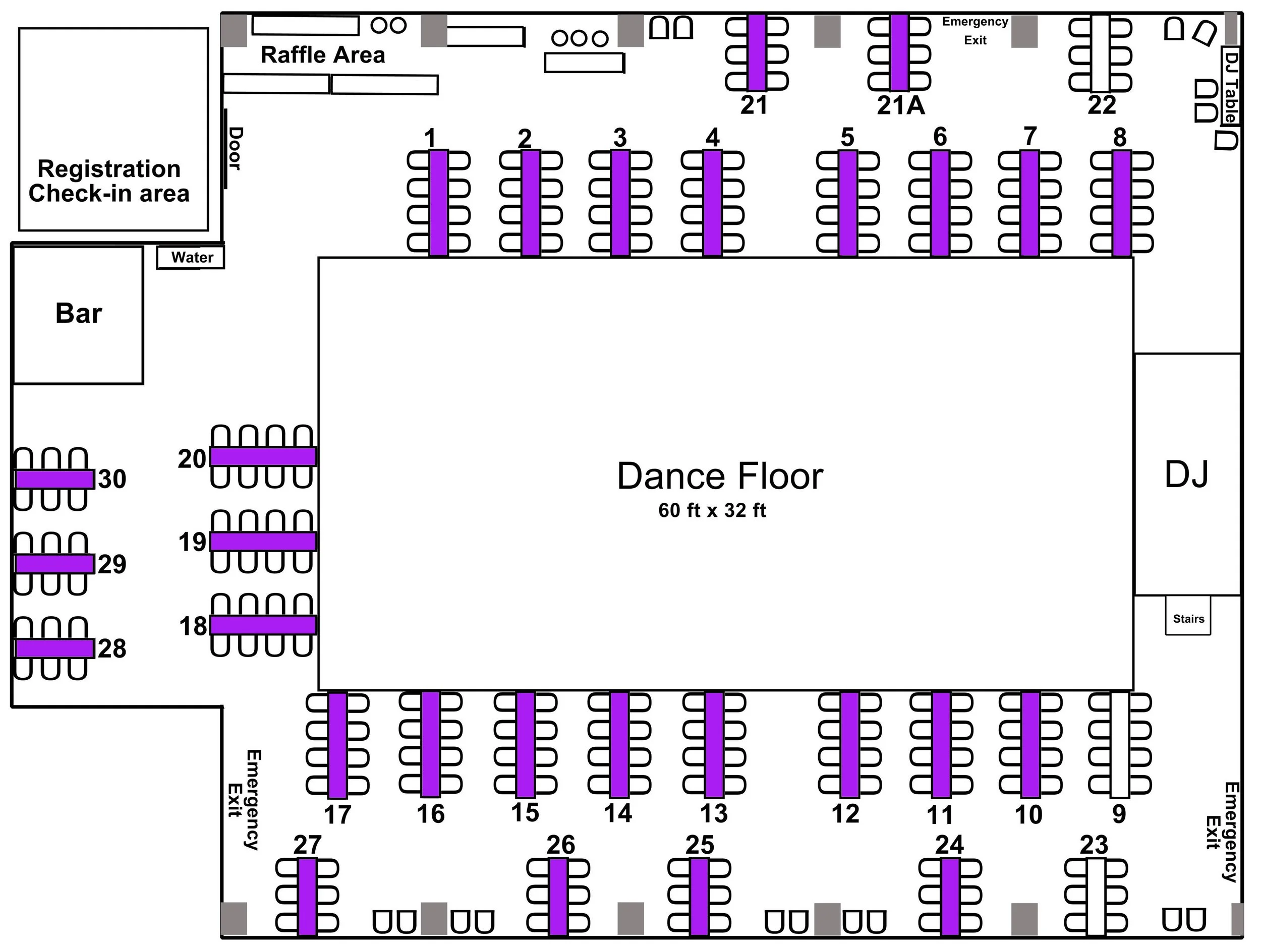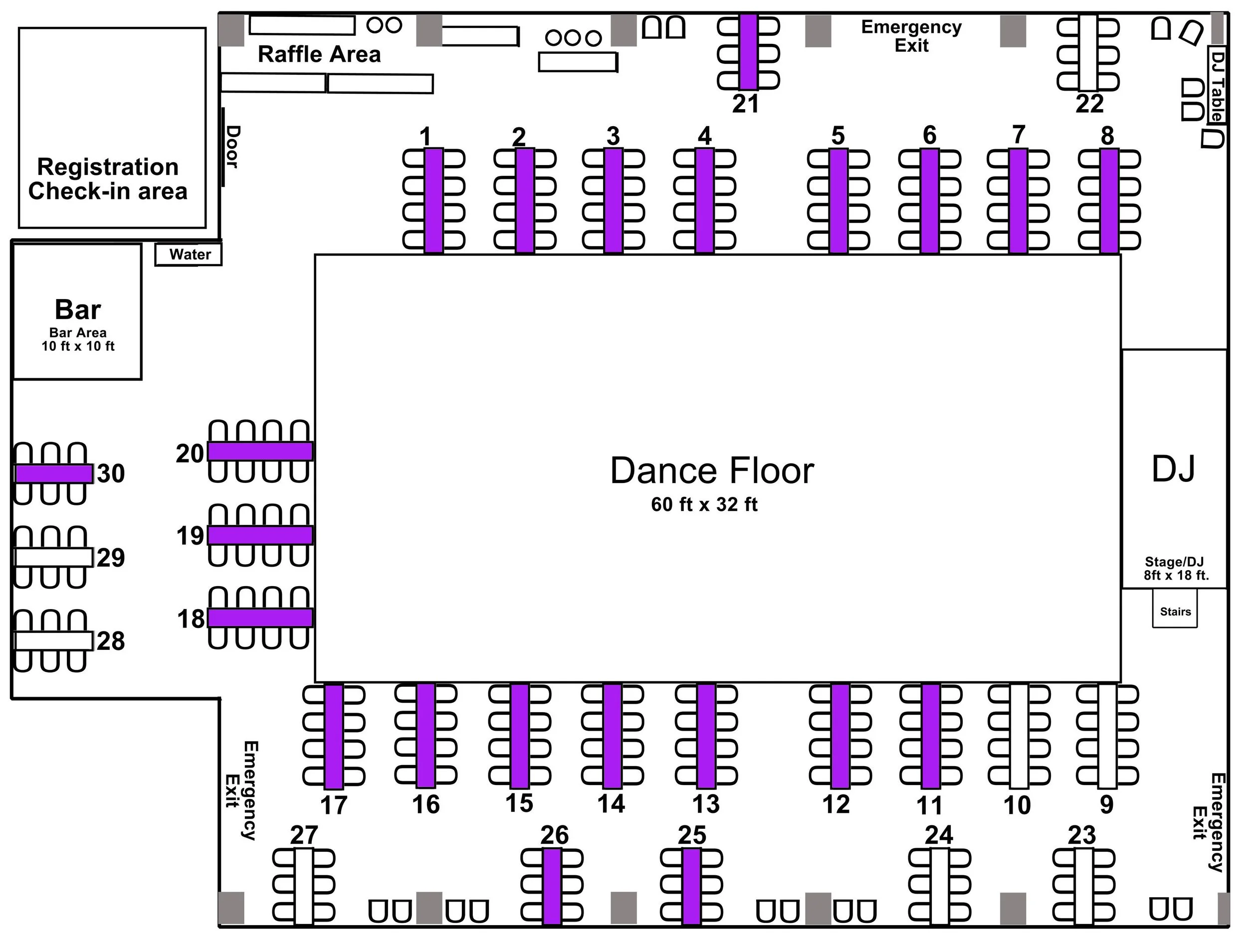 Check the ballroom layout below to learn what tables are available. Those in purple are already sold so don’t wait until the last minute… Book now! Contact Mike Lapina for information at 630-244-7306.
